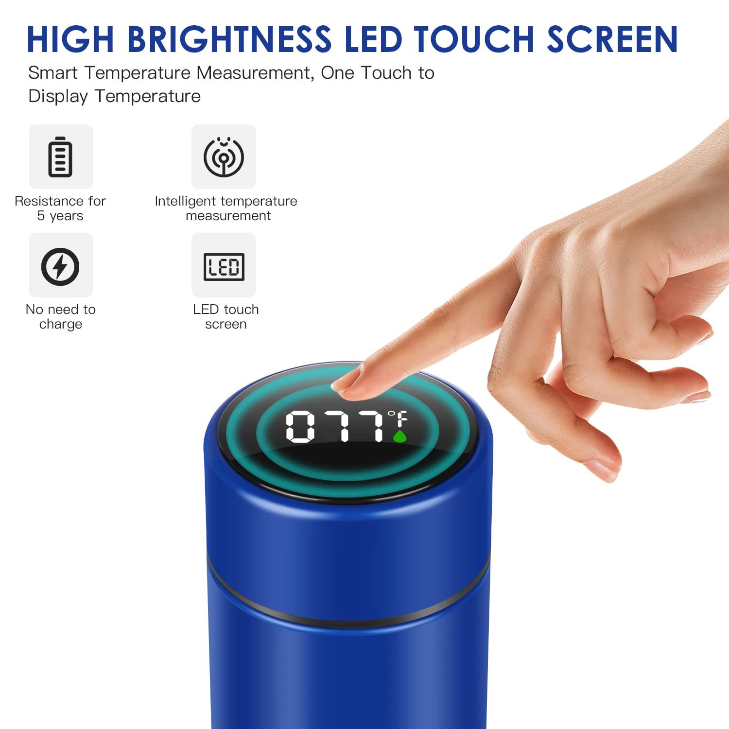 Specification: Product Name: LED Thermos Mug Capacity: 500ml / 17 oz Size: 22.5cm * 6.5cm Material: 304 stainless Characteristic: -Smart LCD touch screen You do not have to use your mouth to measure the temperature and avoid burns. High brightness LED touch screen, intelligent temperature measurement, one touch to display the temperature. It is not necessary to recharge, it contains a long-lasting battery of up to 5 years. The touch switch turns on and then automatically turns off in 3 seconds. -Smart water bottle Our leak proof travel mug can block heat transfer. The vacuum bottle can keep pro liquid heat above 68 ° C for 6 hours and liquid cooling below 5 ° C for up to 6 hours. It is longer than other vacuum bottles. Up to 12 hours long-term insulation for hot and cold water, you can still drink hot water in the morning. -Leak proof design The travel mug is sealed and spill-proof to ensure a perfect, secure seal and reliable, leak-free performance. Therefore, after the lock, you can put it anywhere. Avoid accidentally opening the package. -Food grade material Food grade 304 stainless steel + polypropylene sleeve + silicone sleeve. 100% BPA free, toxin free. Environmental friendly. -One cup for multiple uses Stainless steel bottles are suitable for home, work, sports, car, beach, even camping or hiking. Suitable for water, tea, coffee, carbonated drinks, wine and beer. Easy to use, easy to carry and clean. Package includes: 1 * thermos cup